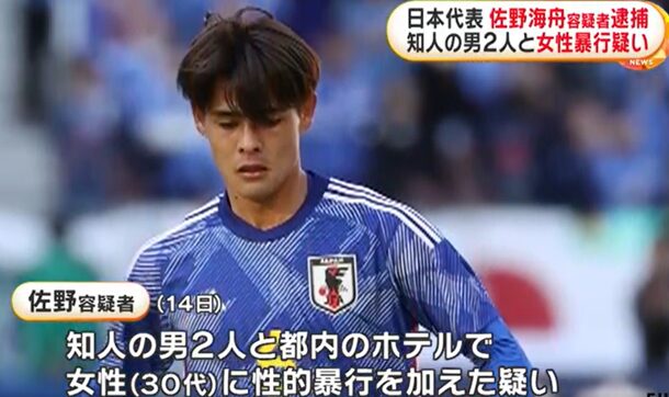 @nanasiajax<サッカーの日本代表としてことしのアジアカップに出場した佐野海舟選手が、東京都内のホテルで女性に性的暴行をした疑いで警視庁に逮捕されました。> サッカー日本代表 佐野海舟選手 女性への性的暴行の疑いで逮捕|NHKニュース(2024/7/17)www3.nhk.or.jp/news/html/2024…