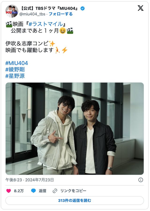@x2_0v楽しみにしていた映画「ラストマイル」を見に行ってきました。物語の本筋も面白かったのですが、『アンナチュラル』や『MIU404』のキャラクターたちのその後がいろいろな場面に散りばめられていて、ファンサービスが満載でした。嫁さんと「あの人、あそこで出てたよね?」という話ができて、とても楽し… pic.x.com/qkndwtottf